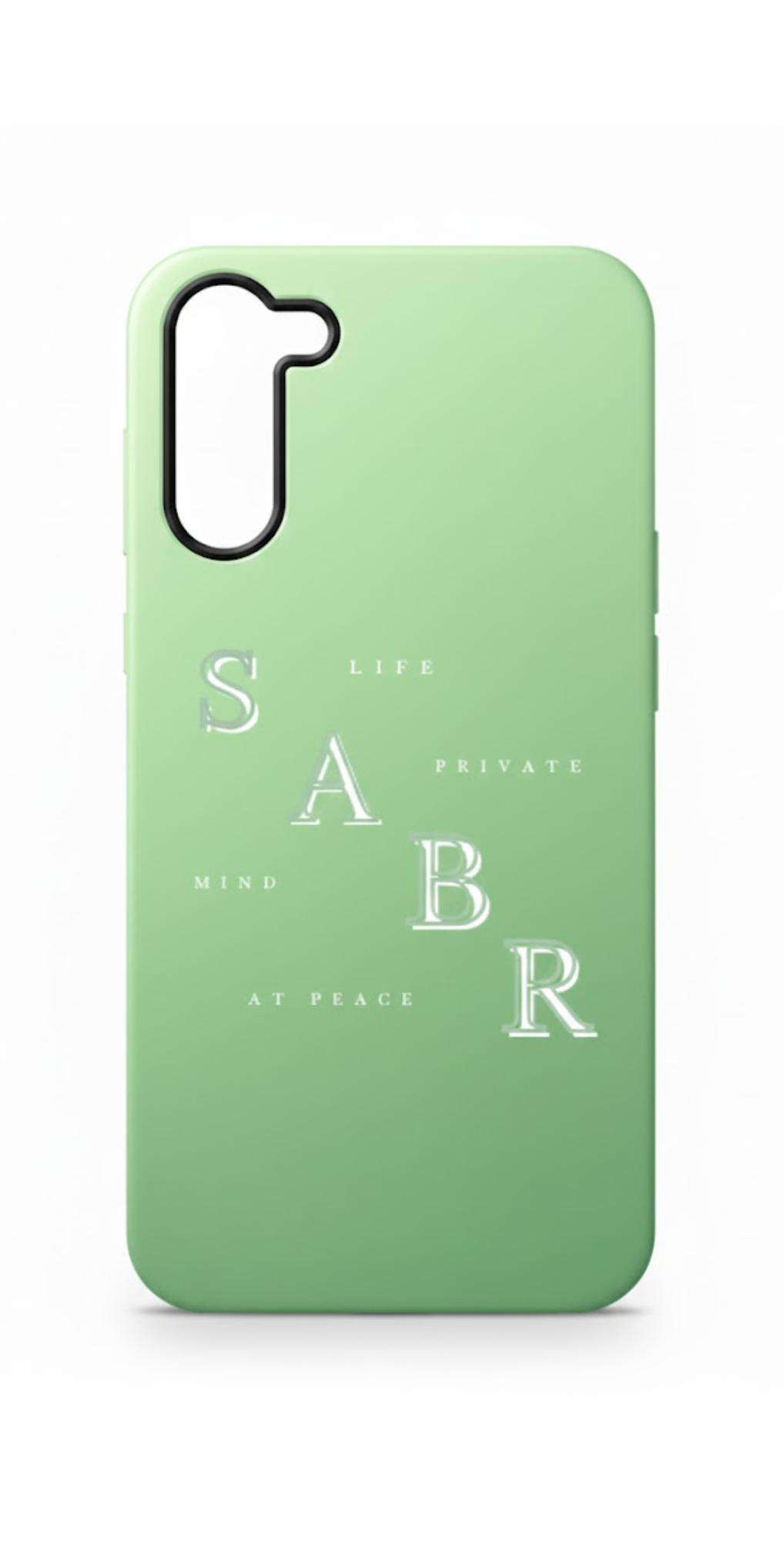 Dit is de SABR Case Green. Een frisse, levendige kleur die rust en vernieuwing uitstraalt. De witte letters en subtiele details maken hem clean en minimalistisch, maar tegelijk opvallend door de felle groene basis.